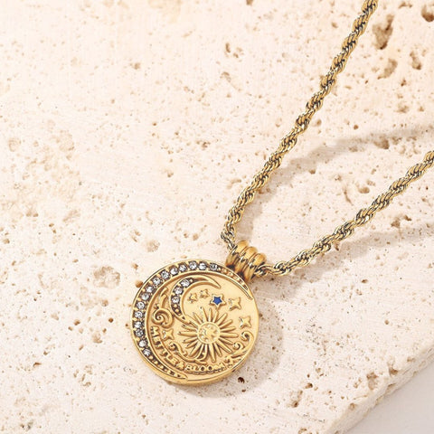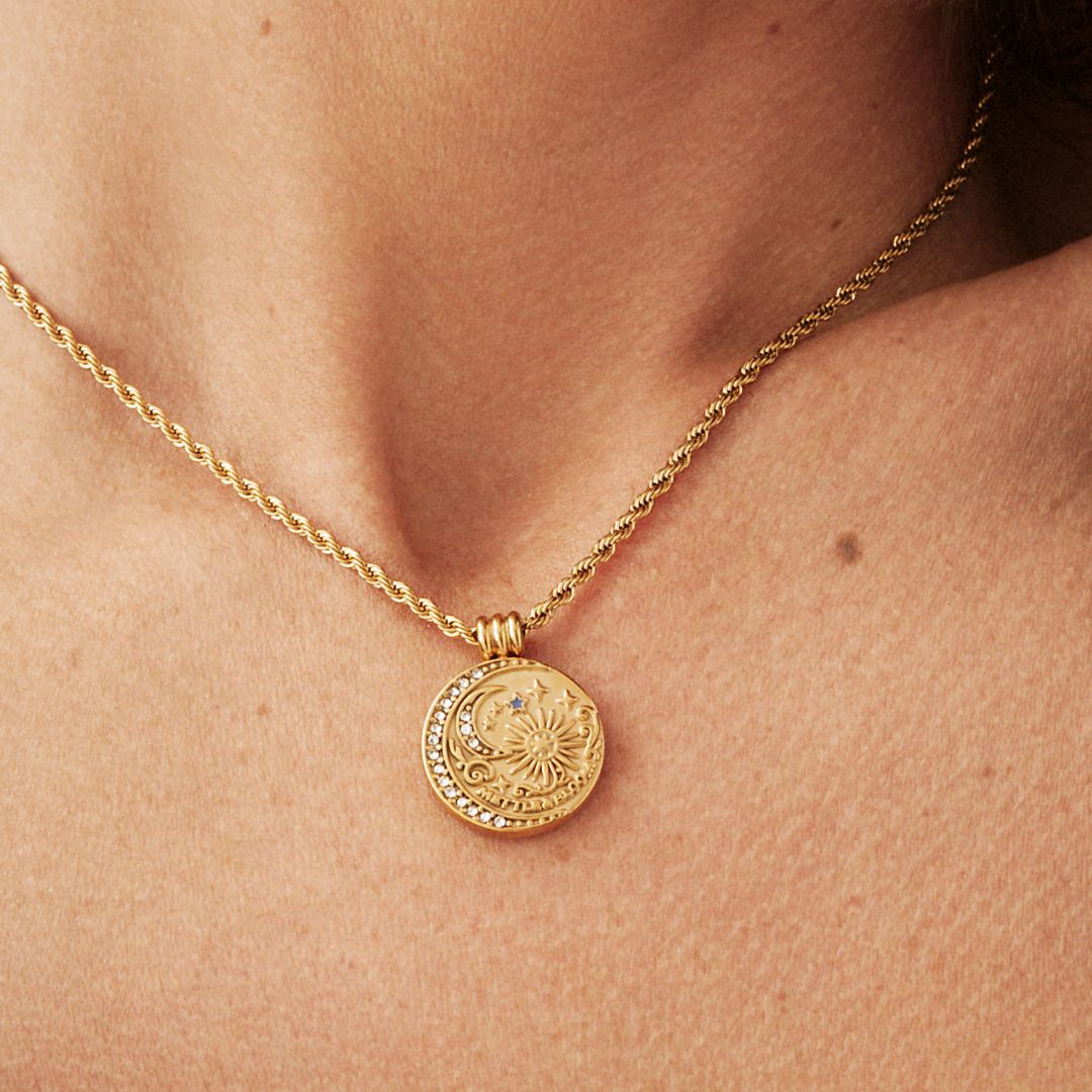 The Bloom Necklace is a powerful emblem of the Mettle & Bloom ethos - Nurture Your Mettle To Reach Your Bloom. Designed for those embracing their strength, growth, and resilience, this piece carries both substance and meaning. At its heart lies a radiant sun, symbolising growth and renewal, encircled by a crescent moon adorned with shimmering stones that catch the light like stars in motion. Tiny celestial motifs - stars and constellations - dance across the surface, telling a story of dreams, courage, and endless possibility.