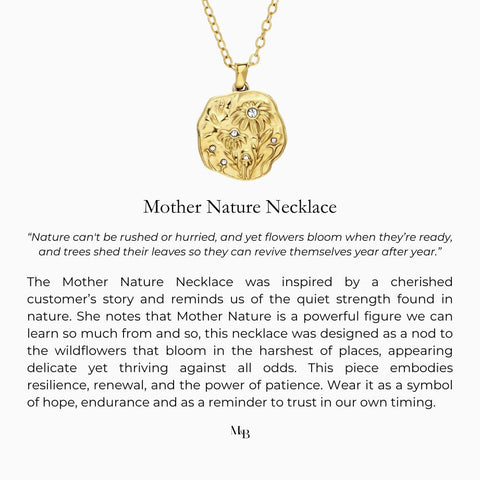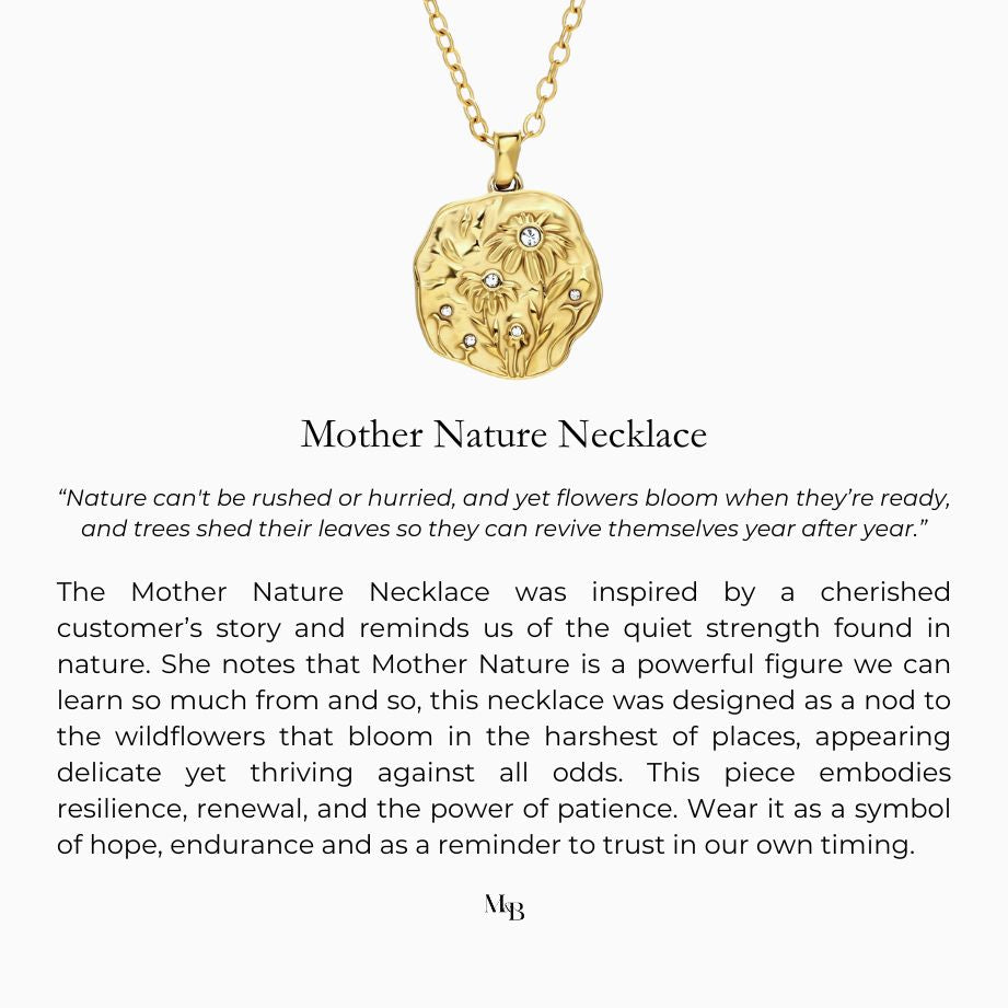 The Mother Nature Necklace is inspired by the quiet resilience of the natural world and the beauty that surrounds us. A cherished customer got in touch with us and shared how empowered her Mettle & Bloom pieces make her feel while navigating personal challenges. She shared how she finds strength in the small things, like the wildflowers she sees while out for a walk along the seaside. They appear fragile, yet they withstand the wild winds and the crashing waves, thriving against all odds. She shared "I think Mother Nature might be the most powerful figure we can turn to and learn from. It also ties in with your ethos of Mettle and Bloom.”