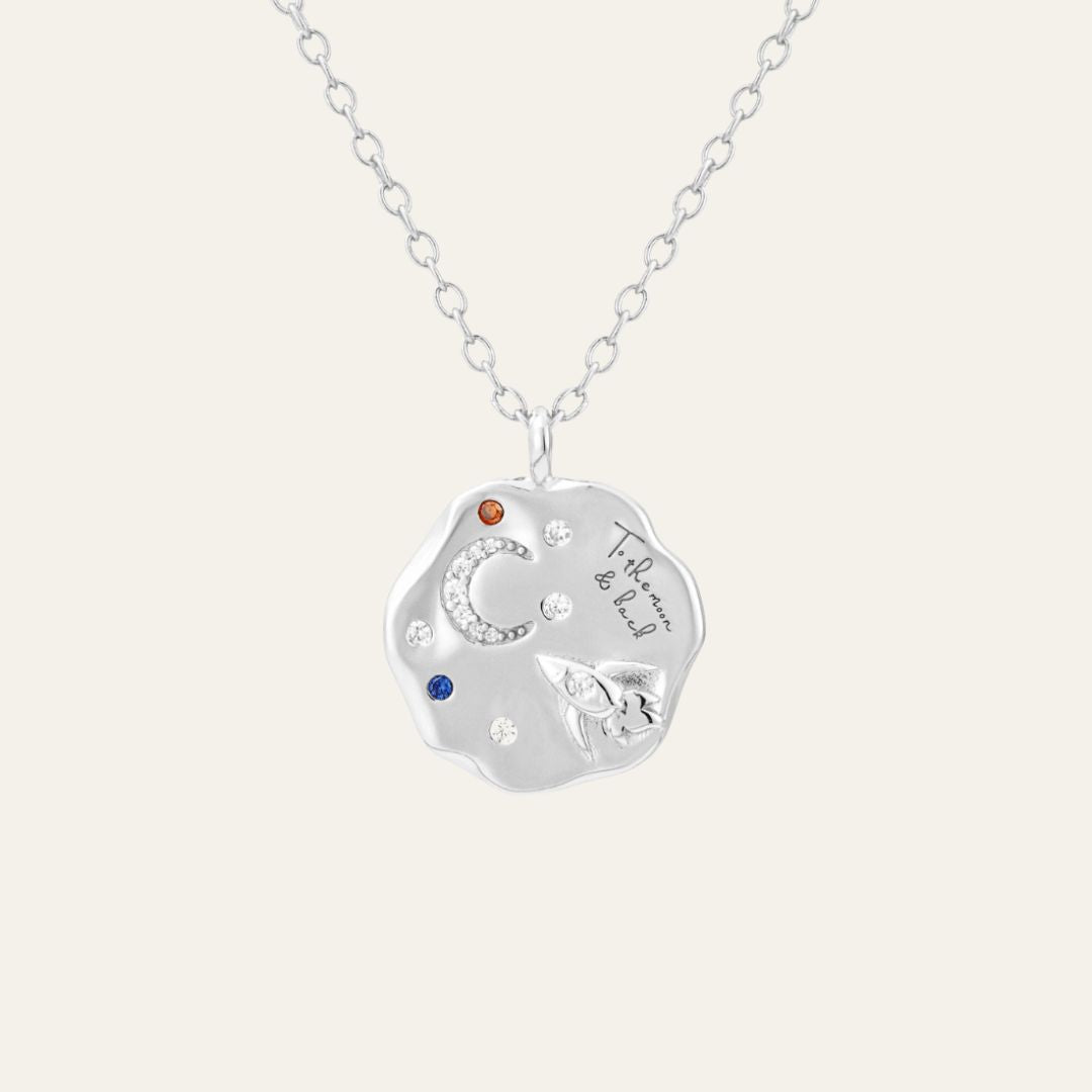 A heartfelt tribute to the ones we love to the moon and back, this beautifully crafted necklace is a symbol of boundless love, adventure, and connection.